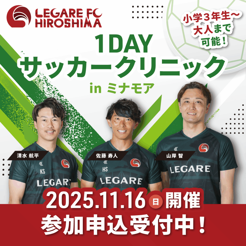 広島駅ビル ミナモア「1Dayサッカークリニック」参加者募集のお知らせ